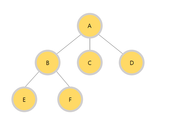 - 노드(node) : 트리를 구성하는 각 요소 A, B, C, D, E, F