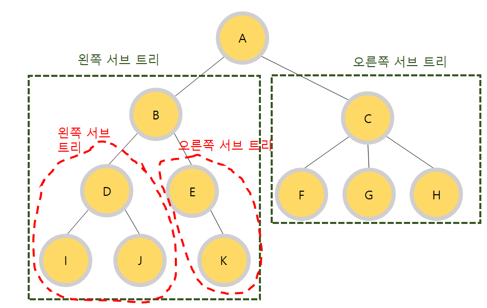 서브 트리란 하나의 트리를 구성하는 왼쪽과 오른쪽의 작은 트리를 가리킨다. 서브 트리 역시 또 다른 서브 트리를 가질 수 있다.