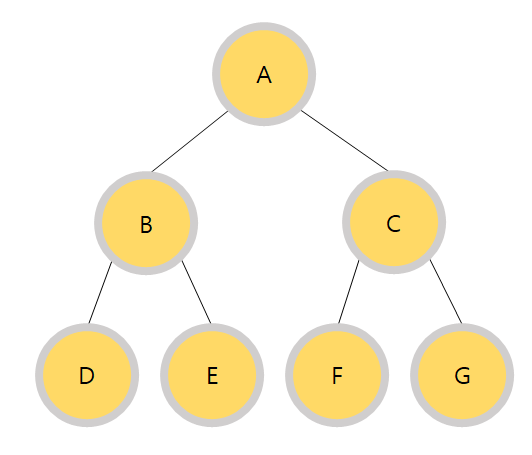 - 루트 노드(root node) : 트리 구조에서 최상위에 존재하는 노드 A