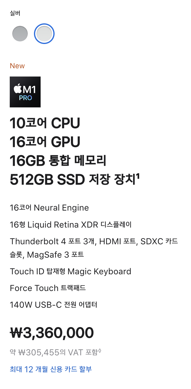 사양은 silicon m1 pro 프로세서에 512g ssd, ram 16g 모델로 기본 모델입니다!