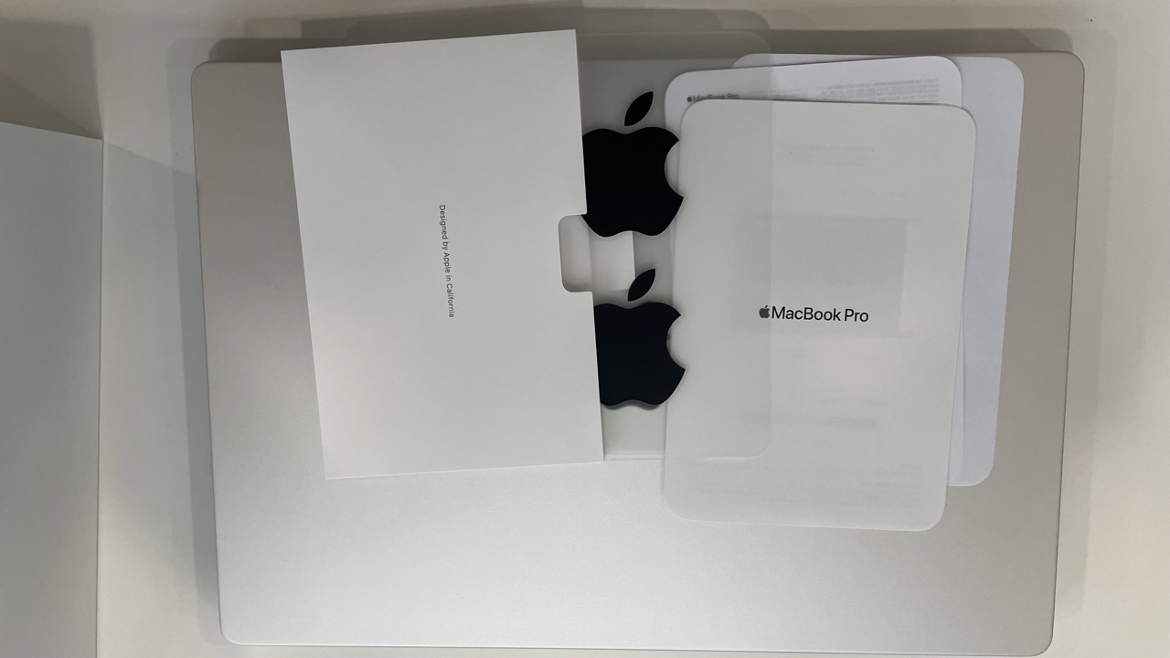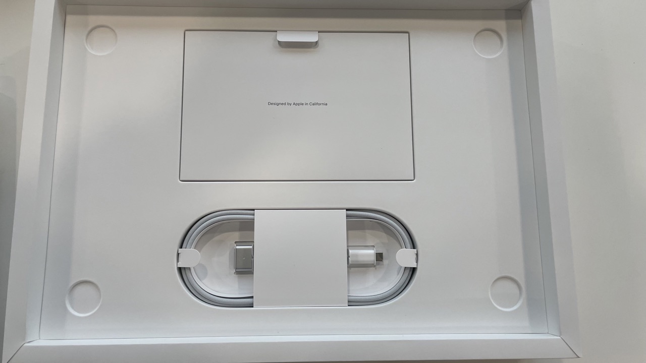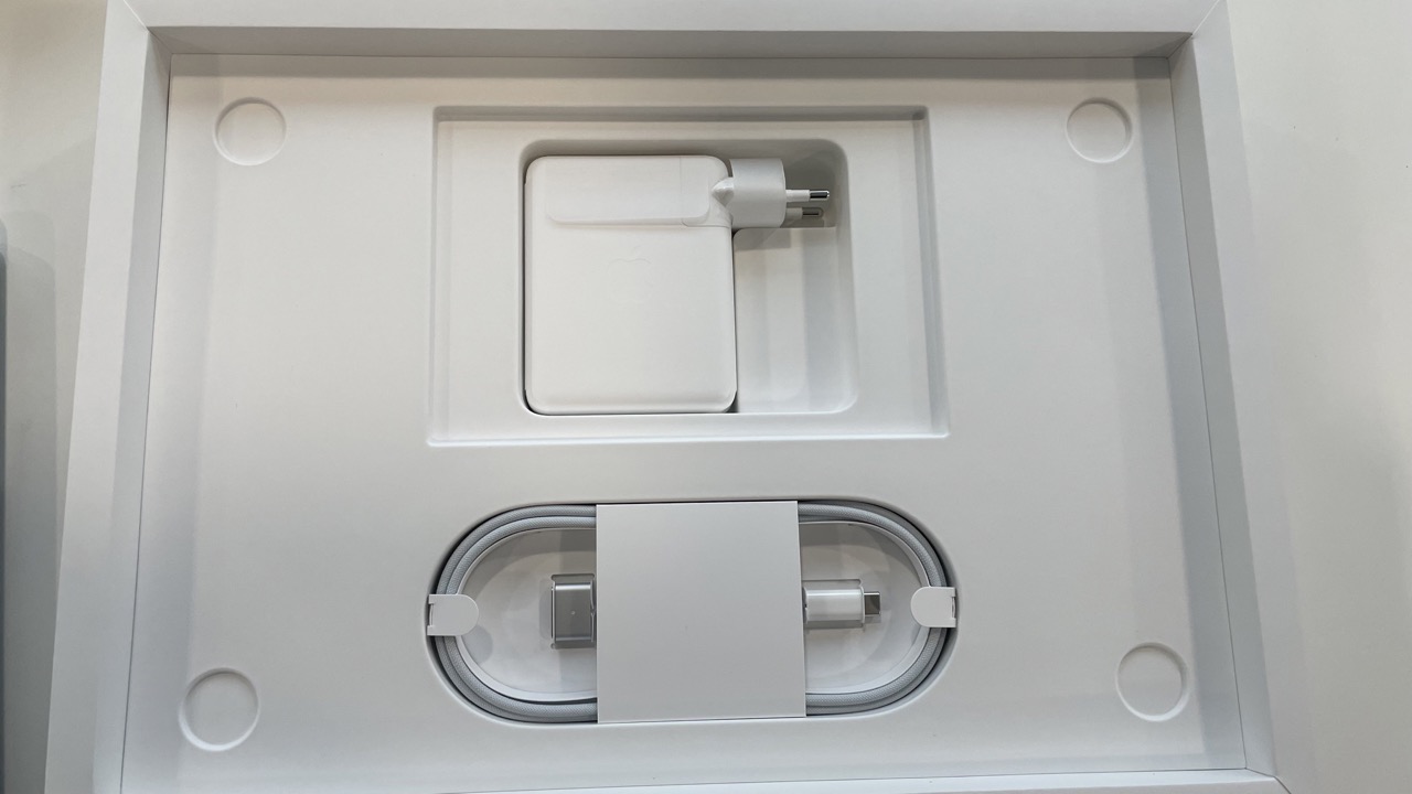 배터리 충전기와 맥세이프 충전기가 들어있습니다. 이번 맥북은 스티커가 검정색입니다!