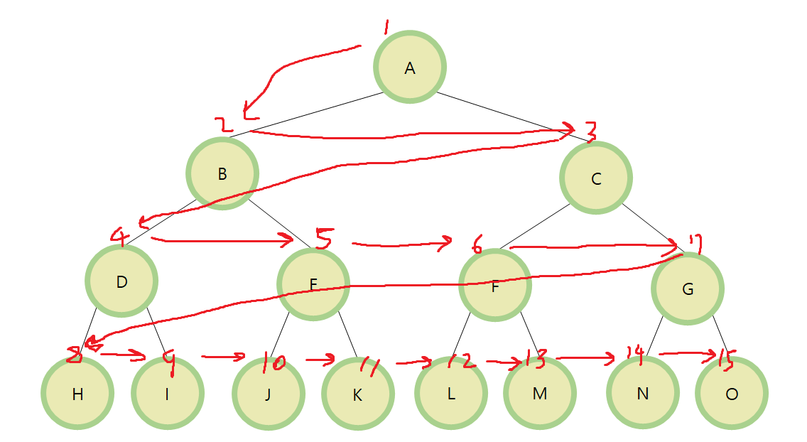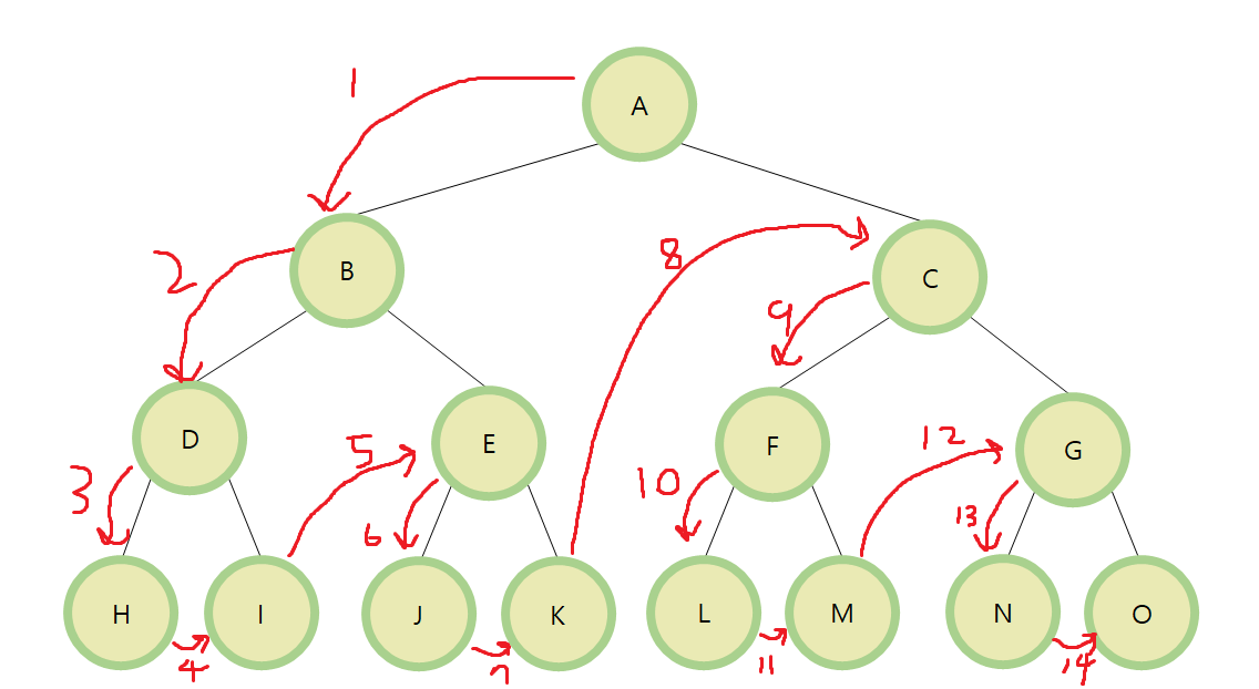 A, B, D, H, I, E, J, K, C, F, L, M, G, N, O 순으로 탐색