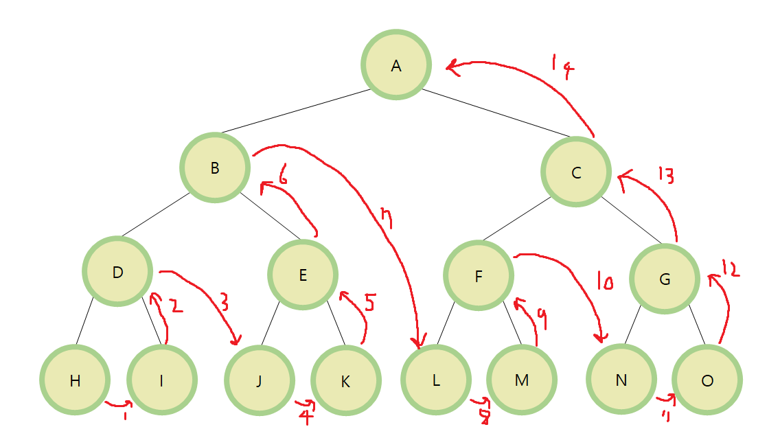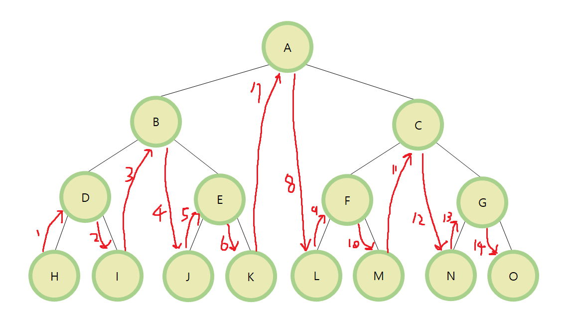 H, I, D, J, K, E, B, L, M, F, N, O, G, C, A 순으로 탐색