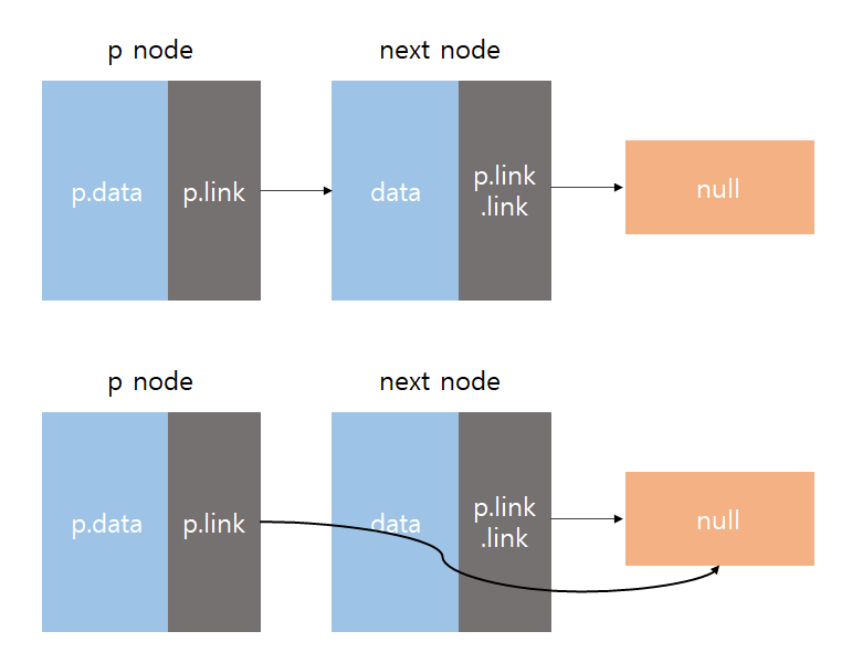 p.link.link는 p의 다음 노드의 링크를 나타내고 p.link.link !== null 을 통해 다음 노드가 있는지 확인하는 것이다. p.link.link가 있다면 p.link = null 로 현재 노드 p에서 바로 link를 끊어주어 삭제가 되는 것이다.