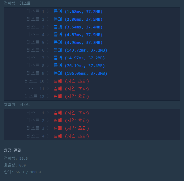 첫번째 코드 정확성, 효율성 테스트 실패