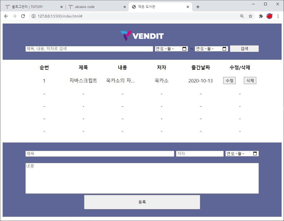 2020/09/03 - [토이 프로젝트] - [자바스크립트] 작은 도서관 프로그램 만들기 (쿠키, 로컬, 세션 스토리지의 개념 포함) [자바스크립트] 작은 도서관 프로그램 만들기 (쿠키, 로컬, 세션 스토리지의 ��