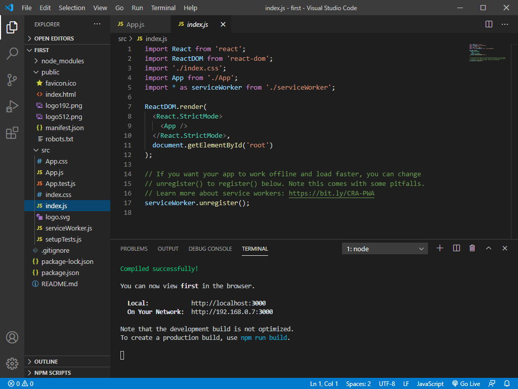 이 두개는 말 그대로 css를 정의해주고 있다. App.css는 App.js의 css이고 index.css는 index.js의 css를 맡고 있다. 우리는 이 두 곳의 내용을 깔끔하게 정리하고(지우고) 시작하도록 한다.