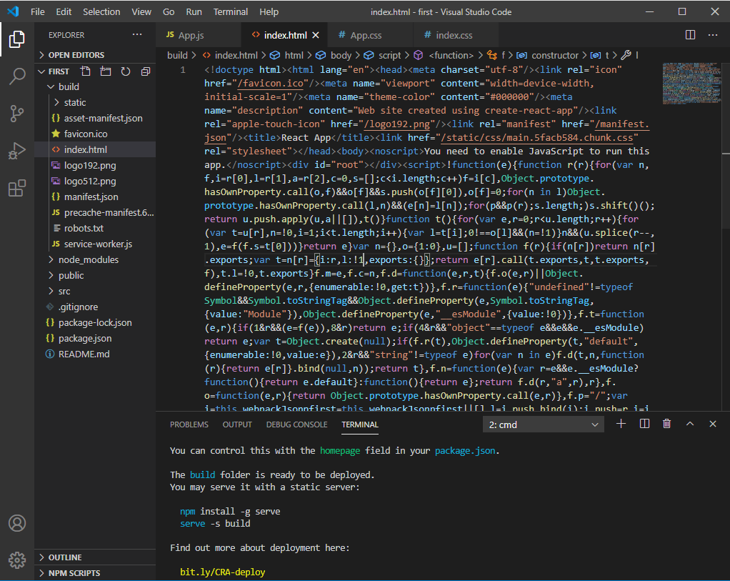 아래 명령어를 입력하게 되면 build 파일이 생긴다 이곳에는 2장에서 여러개로 나뉜 파일들이 필요한 것들만 하나로 소스코드까지 줄여주면서 컴팩트하게 만들어준다.